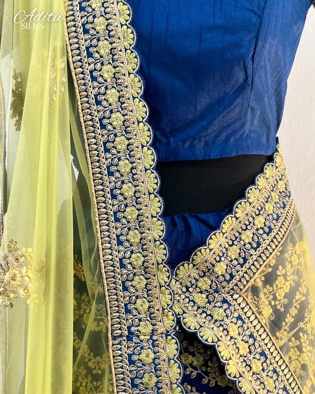 A gorgeous, embroidered lehenga with ready-made blouse. Intricate embroidery and contrasting colours across the piece make this a stunning outfit!