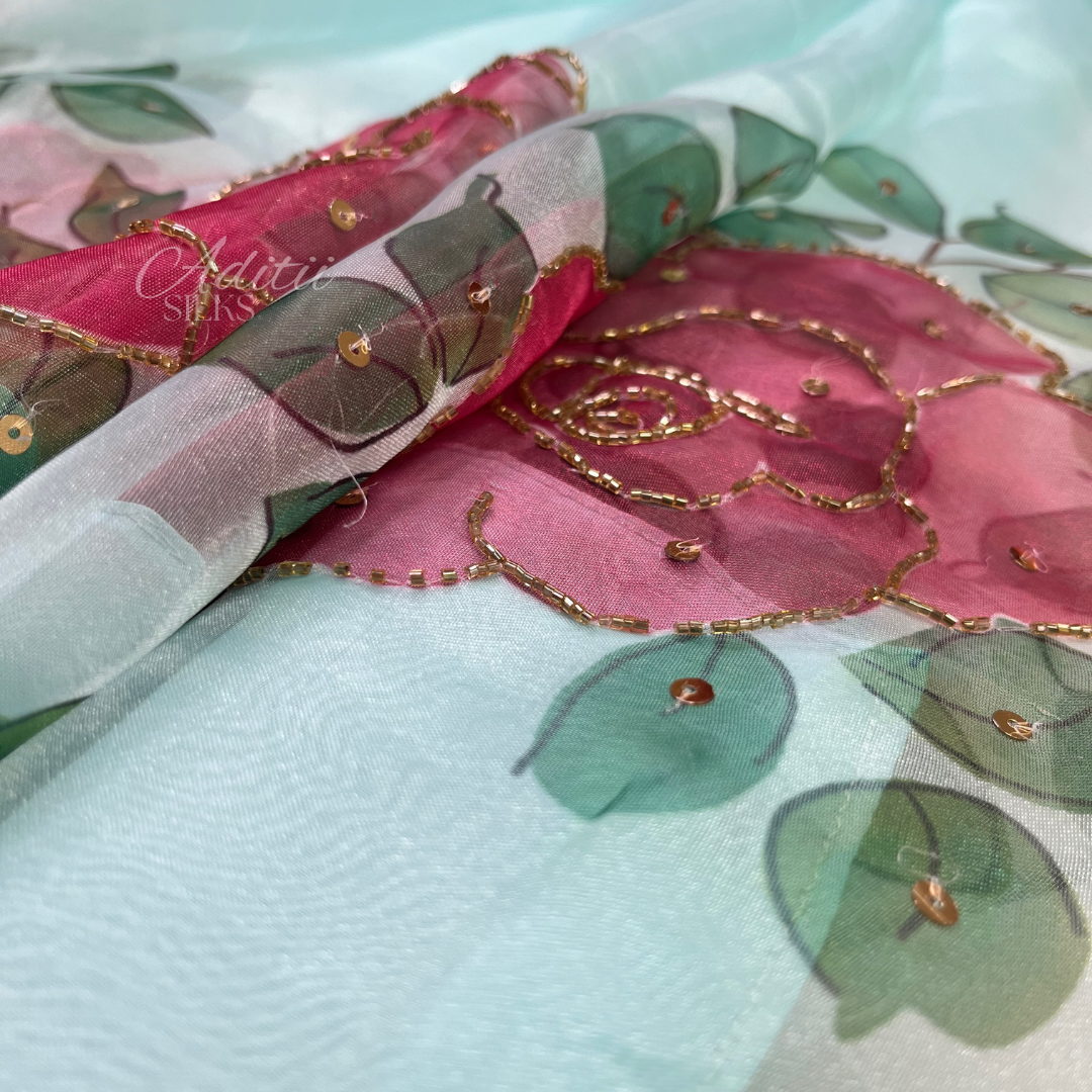 A beautiful organza saree embroidered with sequins and jari thread, on stunning floral designs! Available in floral orange, and floral pink.