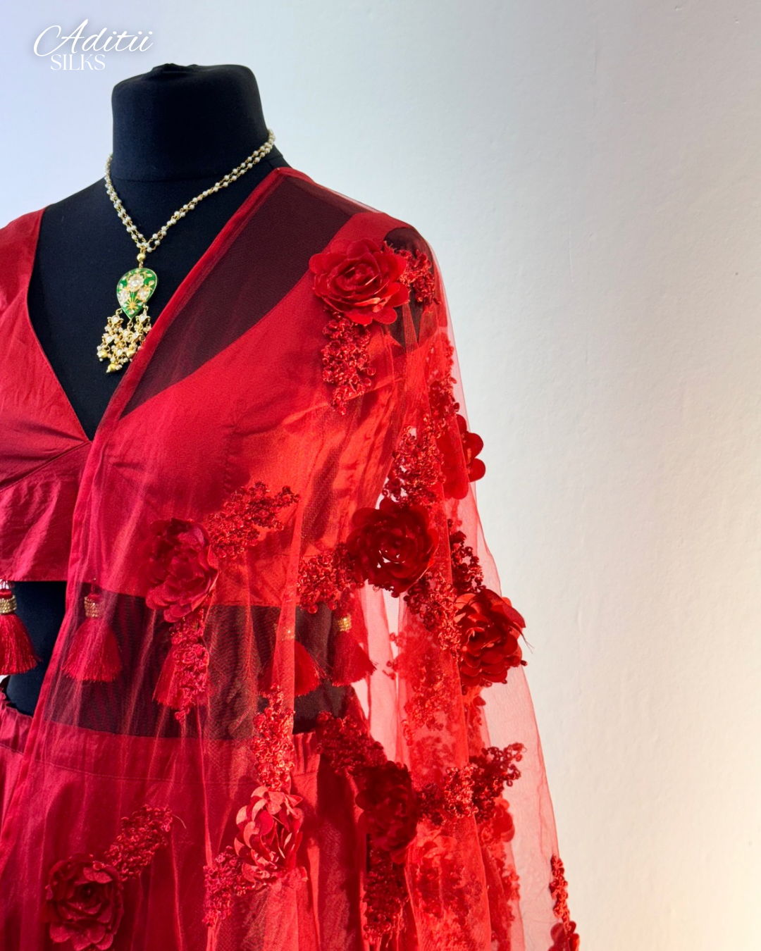 A stunning, ref taffeta lengha is a stand-out piece this season. A delicate blouse finished with red and gold tassels, a panelled taffeta skirt and an elegant dupatta makes for a gorgeous ensemble.