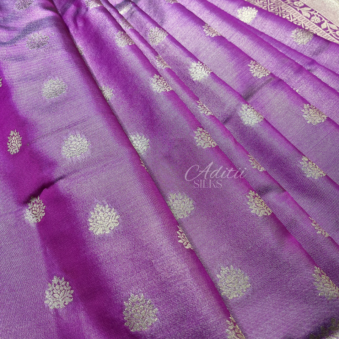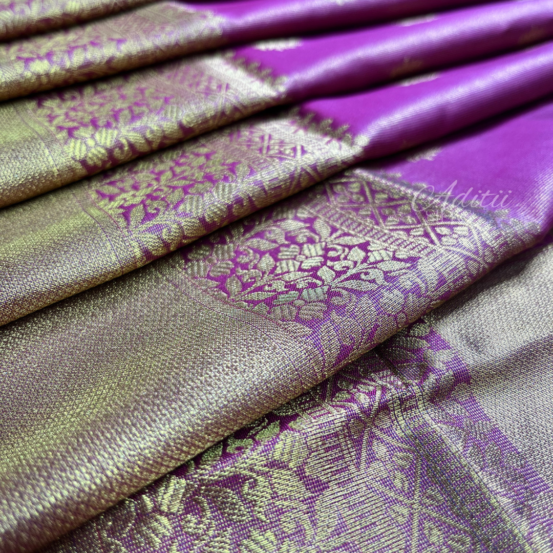 A stunning woven silk saree, set with small motifs, brocade-feel pallu and subtle gold shimmer throughout.