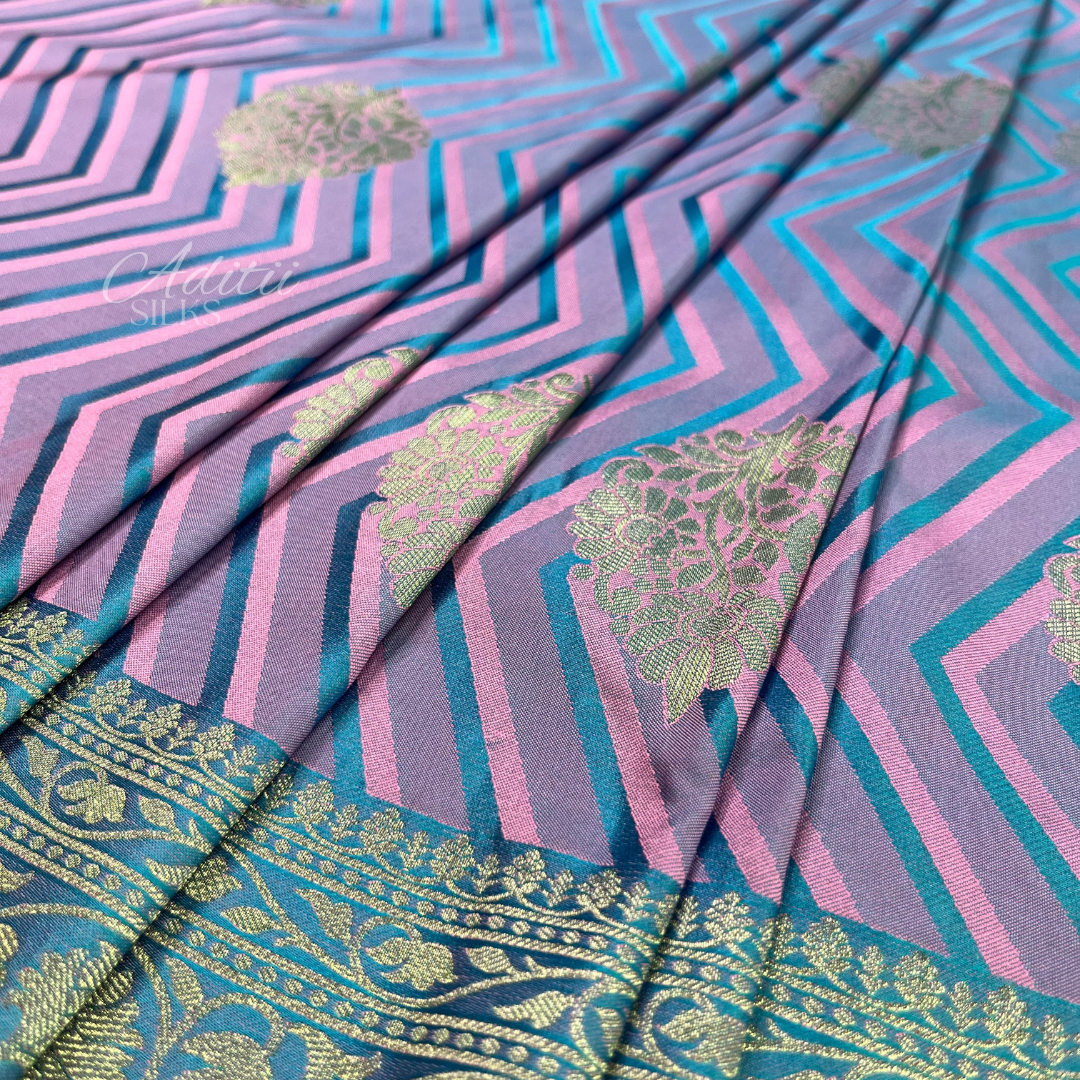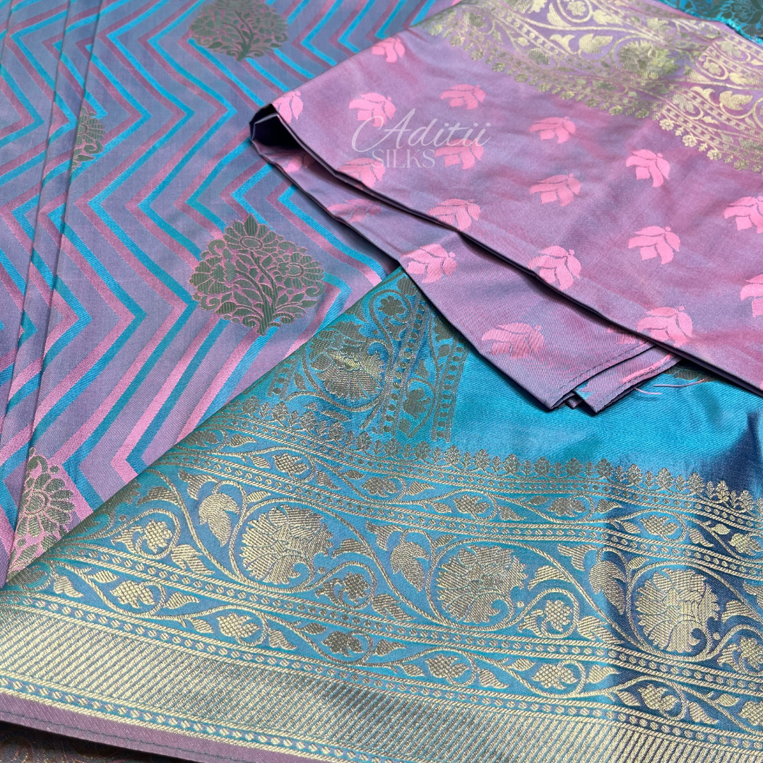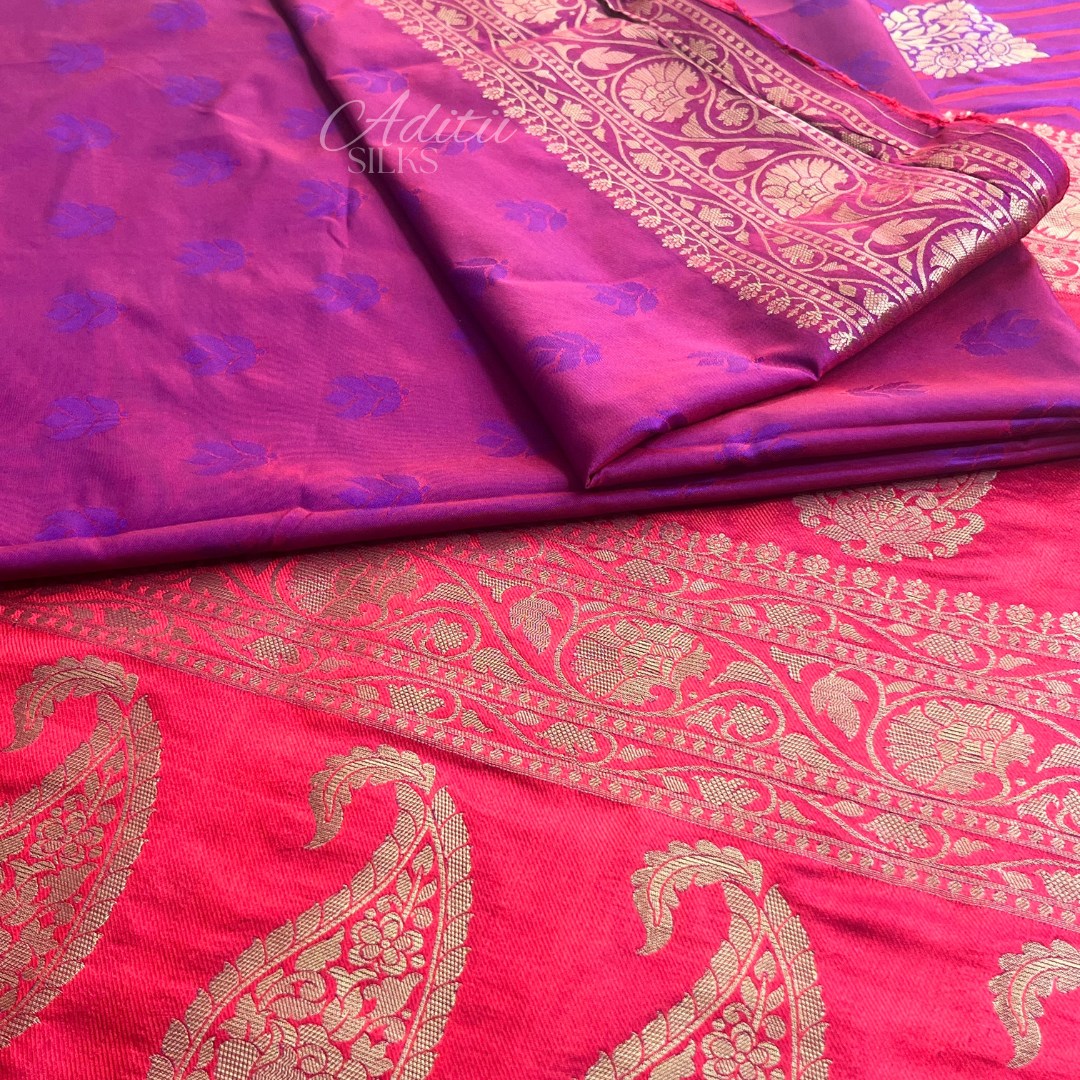 A beautiful two-tone art silk saree, with contrasting single colour pallu and woven silk motifs, complete with matching tassels.